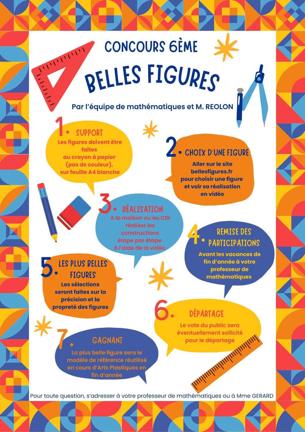 Un concours de figures mathématiques et artistiques est organisé par l’équipe de mathématiques et M.Reolon, professeur d’arts plastiques. Voir l’affiche jointe pour les modalités de participation.